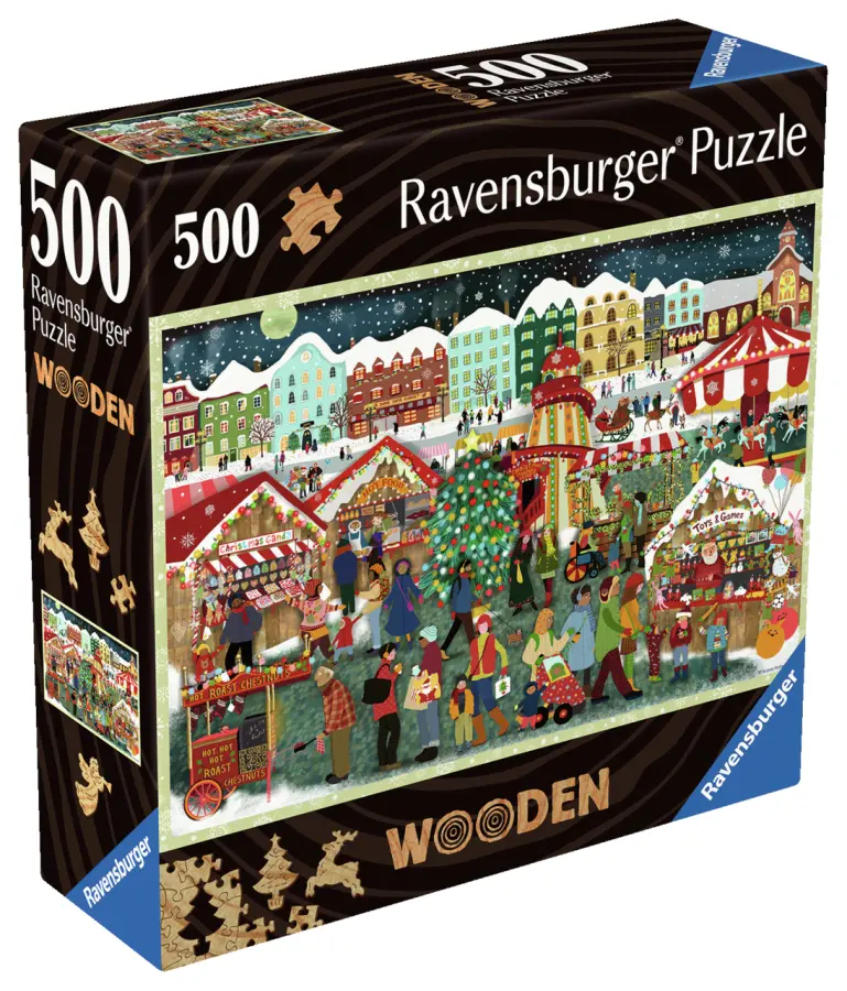 Det är Julmarknad i staden och folk är ute för att köpa godsaker, juldekorationer och julklappar bland de fina stånden. Barnen kan roa sig med att klättra i klättertornet och glida ner för rutschkanan, ta en tur på karusellen eller beundra den stora julgranen. I bakgrunden syns färgglada husfasader, dalande snöflingor och en stjärnklar natthimmel. Motivet är skapat av illustratören Angela Holland.