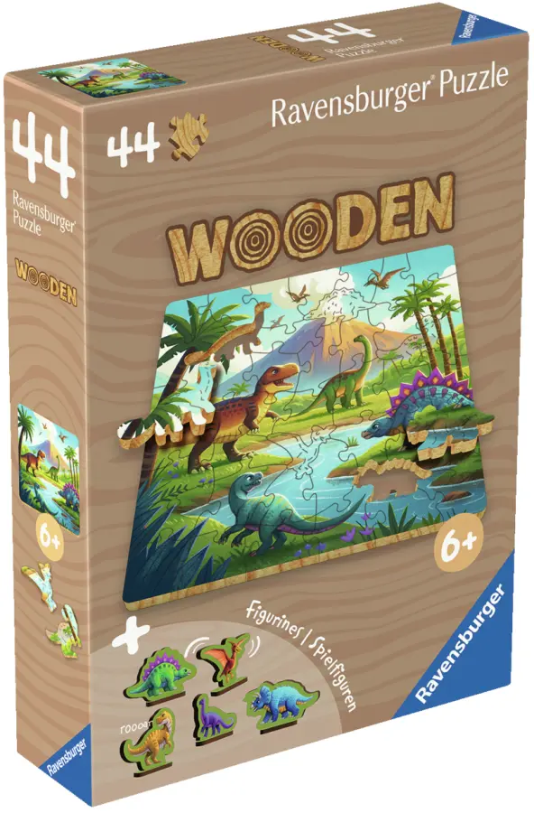 Det här pusslet i trä ger dig nya pusselutmaningar på ett stimulerande och lekfullt sätt! Pusselbitarna är utskurna i trä och bitarna är unika. En del av bitarna har formen av olika dinosaurier och små ställ ingår så att du också kan leka med dem.