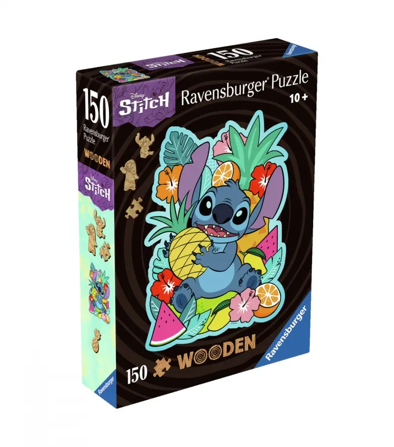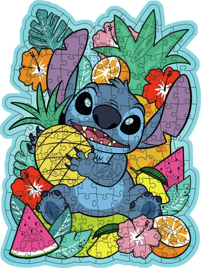 Stitch ur Disneys tecknade serie Lilo och Stisch. Den busiga figuren sitter omgiven av färgglada blommor och frukter med en ananas i famnen.