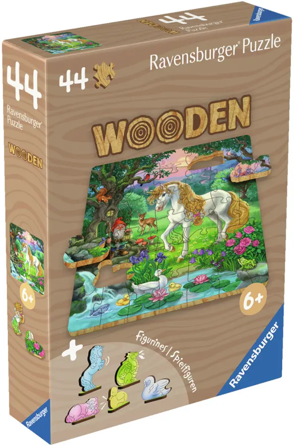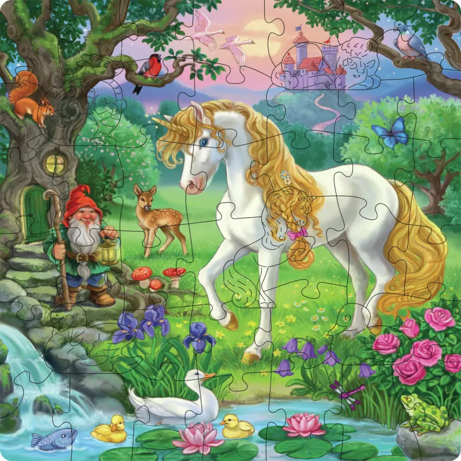 Ett träpussel med motiv av en magisk skog där Tomtar och Enhörningar bor sida vid sida. Utvecklande för motoriken, det logiska tänkandet och med bitar som är lätta att greppa.