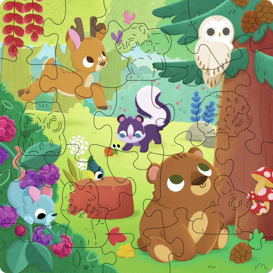 Ett träpussel med motiv av djur i skogen, utvecklande för motoriken, det logiska tänkandet och med bitar som är lätta att greppa.
