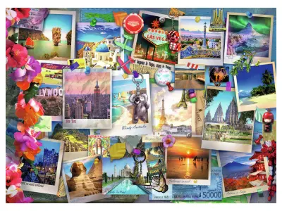 På en anslagstavla hänger bilder och små minnesprylar från resor från världens alla hörn. Några platser som har besökts är Egyptens pyramider, Eiffeltornet i Paris, Hollywood Hills och dess kända Hollywoodskylt, Klippiga ölandskap i Asien, långa sandstränder i Australien, Indiens Taj Mahal, Las Vegas och Norrsken i islandskap. Fina minnen från roliga resor, och det bästa är ju att det (trotts att bilderna är många) finns mängder av platser kvar att upptäcka för någon vars reslust inte är mättad. Bon Voyage!