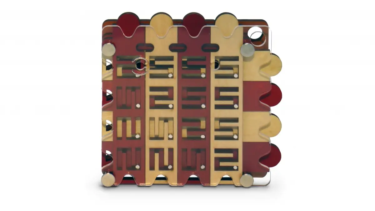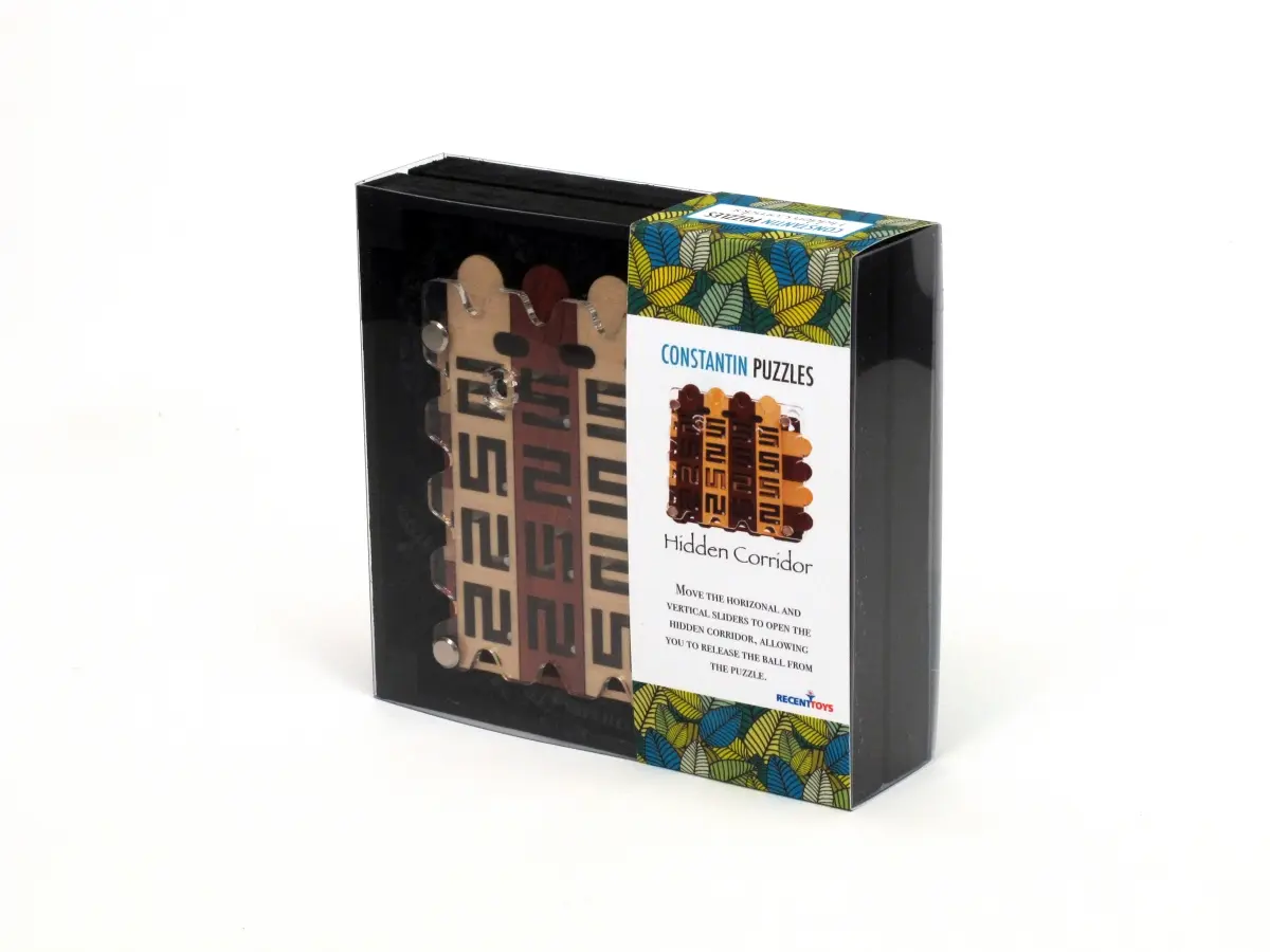 I det här knep och knåp pusslet i trä gäller det att dra i de utstickande horisontella och vertikala delarna för att öppna olika korridorer. Målet är att du ska öppna rätt korridorer och få din lilla järnkula att passera genom korridorerna för att till slut få ut den ur pusslet.
