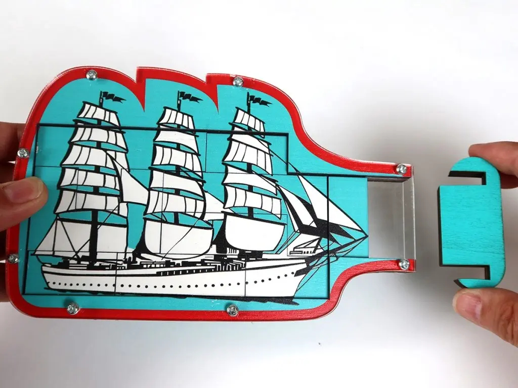 Skaka försiktigt ut alla bitar ur flaskans hals. Använd din slutledningsförmåga, minne och ett försiktigt handlag för att återmontera alla bitar inuti flaskan. Blir det en härlig seglats eller risk för sjösjuka?