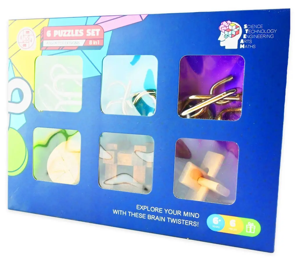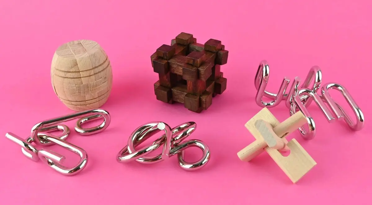 Sex kluriga IQ-pusselutmaningar i trä och metall.
