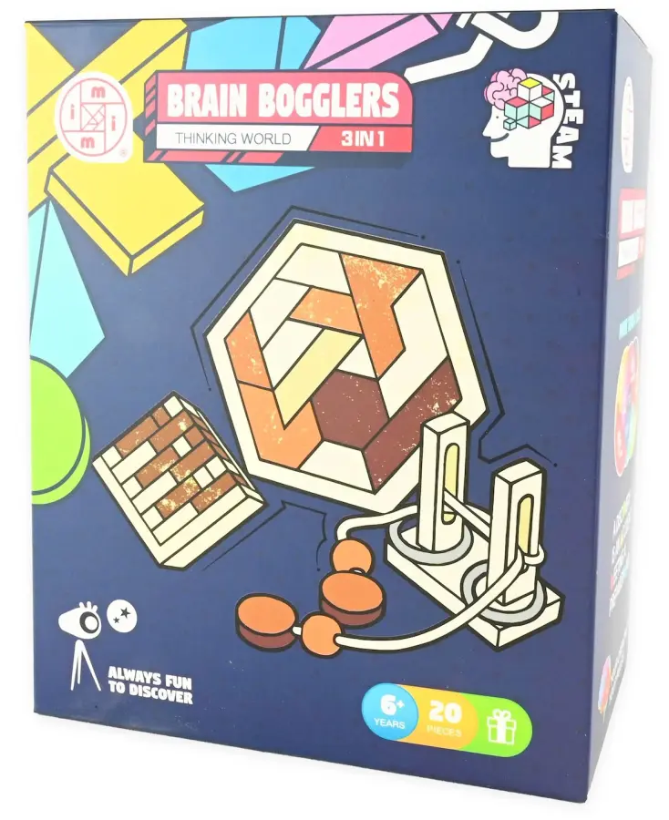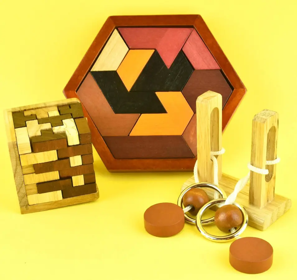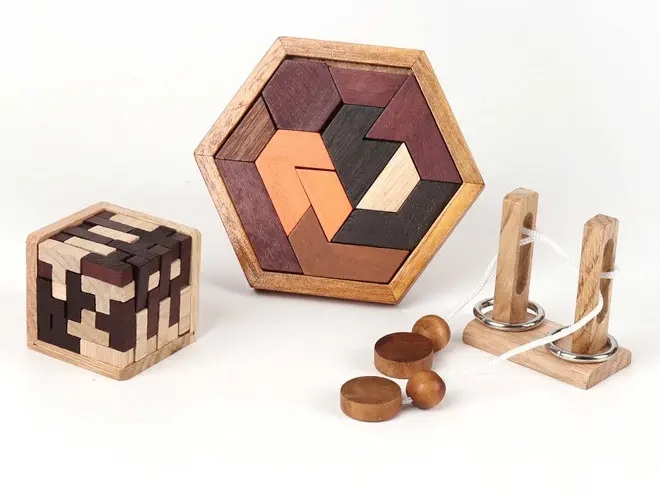 Träna dina kognitiva färdigheter, ditt logiska tänkande och din problemlösningsförmåga med tre härligt kluriga utmaningar i trä.
