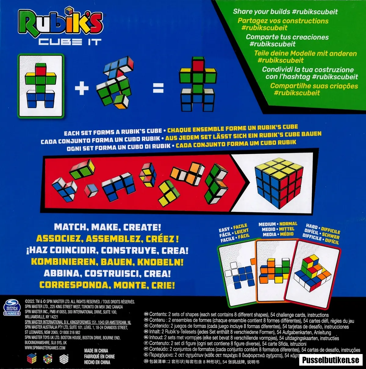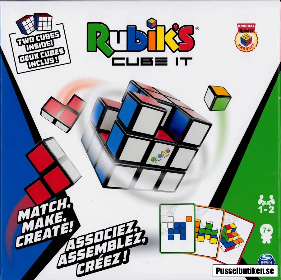Ett klurigt logikpussel som använder de välkända färgerna och formen på en rubikskub. I lådan finner du två set (som tillsammans formar två kuber), 54 kort och instruktioner.