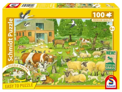 Utanför ladugården finns en stor grön äng och här har lantgårdens alla djur samlats för en härlig stund i solen. Alla djuren njuter av varandras sällskap och de söta djurungarna leker med varandra. Ett perfekt pusselmotiv för djurälskaren med mycket att upptäcka under pusslandets gång.