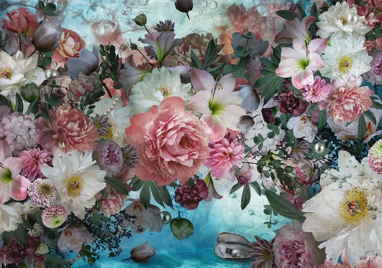 Blommor av olika sorter i rosa, vita och gröna nyanser. Blommorna ligger i vatten och på botten skymtas en mussla och pärlor. Motivet är skapat av illustratören Beth Sheridan.
