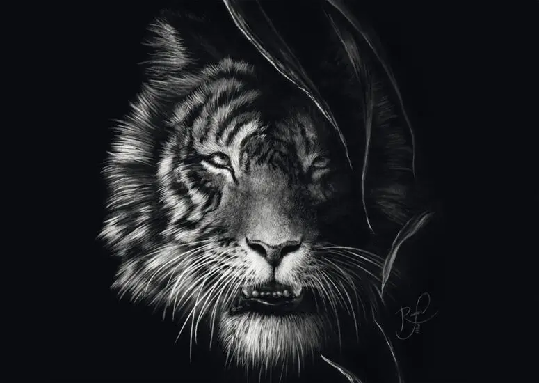 En ståtlig tiger smyger sig fram ur djungelns bladverk. Den stirrar rakt mot betraktaren och man kan nästan känna dess varma andedräkt. Pälsen är omsorgsfullt detaljerad och "färgskalan" går i vitt, svart och grått. Ett mäktigt motiv som ger pusslaren en extra utmaning med sin kolsvarta bakgrund.