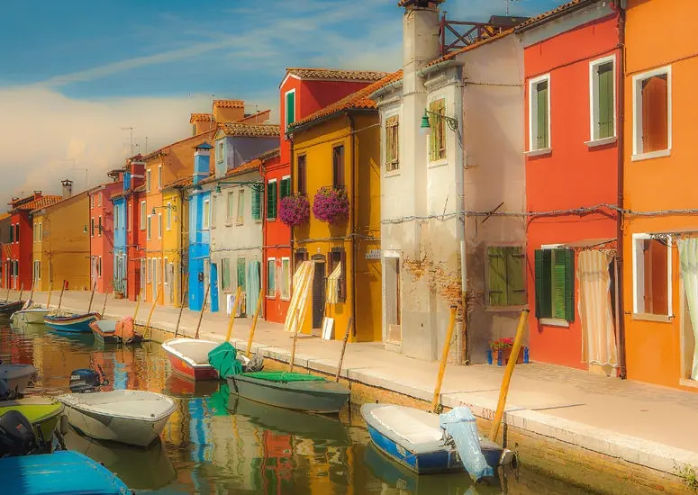 I Italien inom Venedigs kommun ligger ön Burano, känd för sin pittoreska charm och öbornas vackra handarbeten. I motivet ser vi Buranos omtalade arkitektur med färgglada hus och vid kajen ligger båtarna förtöjda i väntan på nästa dags fisketur.