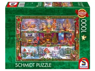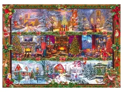 Det är juletid och i det här pusselmotivet får vi inte mindre än 9 vackra små Jullandskap av den älskade konstnären Dominic Davison. De små motiven är inramade tillsammans om omges av en julig ram full av mistlar, julkulor och tomtar.