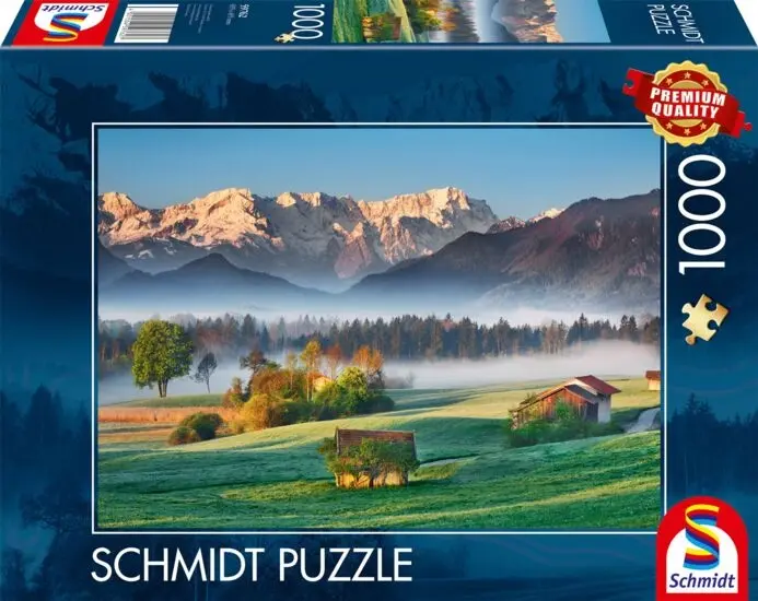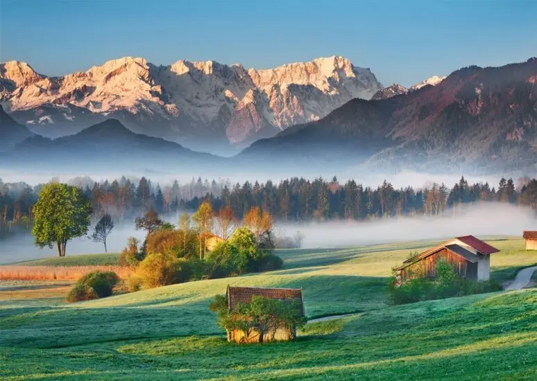 Vy över Garmisch-Partenkirchen i den tyska delstaten Bayern. I förgrunden ett grönt böljande landskap i morgondis som gränsar mot skogen, och i bakgrunden tronar den solbelysta bergskedjan.