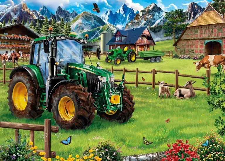 Två traktorer av märket John Deere står på en alpin betesplats bland kor och getter. Tre byggnader kan skymtas, varav en av dem kan antas vara en lada för djuren att vistas i. Allt detta omges av höga berg.