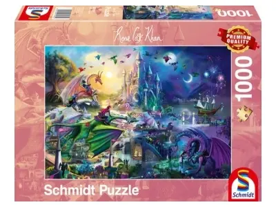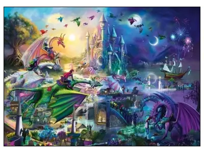 Drakryttartävlingen är igång och från dag till natt pågår tävlingar och festligheter i detta vackra och färgsprakande fantasyrike. Till vänster i pusselmotivet ser vi kungariket på dagtid dränkt i solljus och till höger har det blivit natt och två månar speglar sig i vattnet. I mitten ligger ett slott med sina vackra tinnar och torn och överallt är himlen full av drakar i regnbågens alla färger.