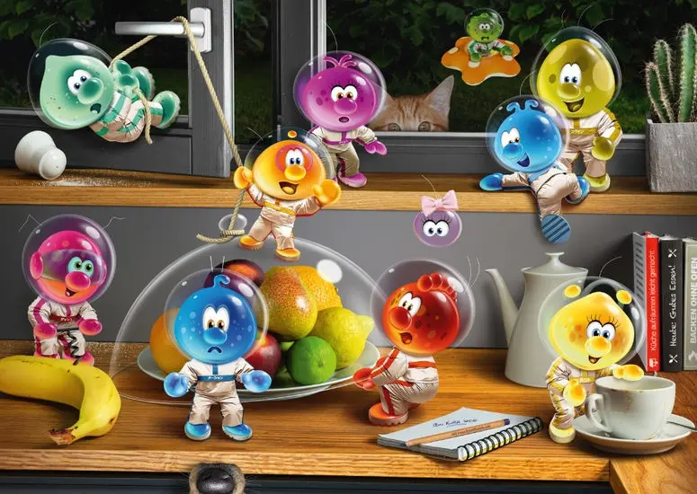 SpaceBubble-rymdvarelserna är på besök för att upptäcka vår planet "Jordens" underbara värld. Idag har de landat på en ny spännande plats, dags att erövra ett kök! Men se upp för katten som ivrigt spejar genom fönstret.