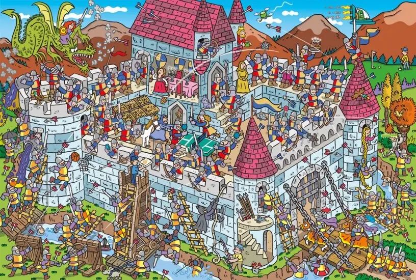 I kungens slott är det full strid! Fienden anfaller men riddarna på slottet är väl förberedda och svärd och pilar viner. För den som har ögonen med sig finns det många roliga och kanske lite udda detaljer att upptäcka.