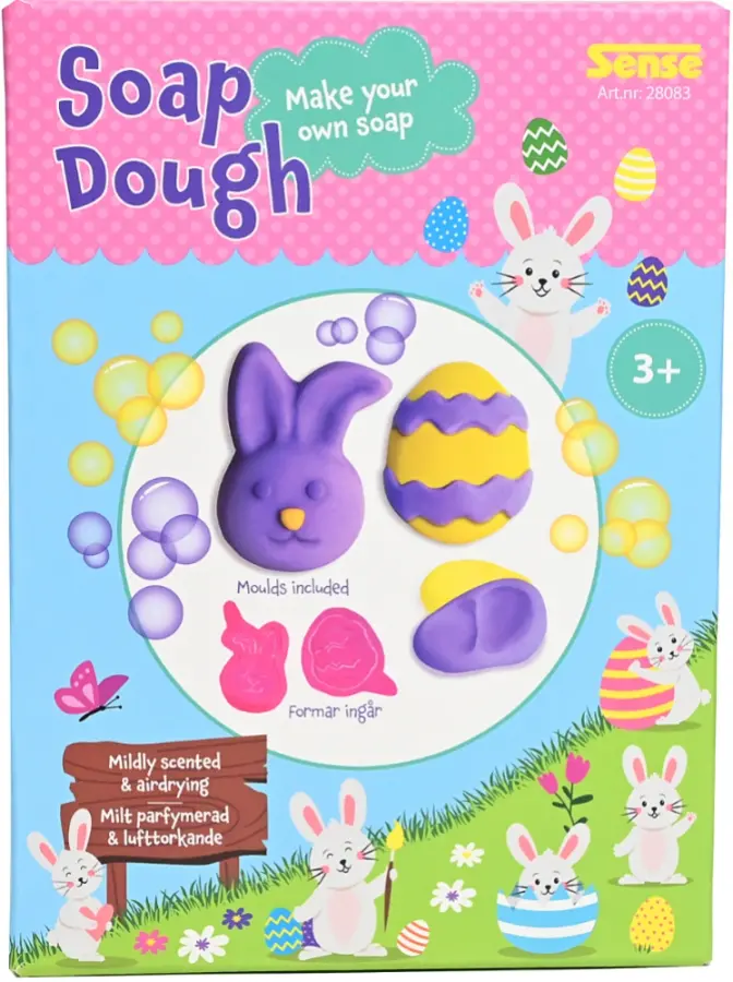 I setet ingår två olika färger av tvål-lera, en form med motivet av en kanin och ett ägg, en meshpåse samt tydliga instruktioner. Perfekt för både barn och vuxna som vill kombinera kreativt skapande med praktisk användning.