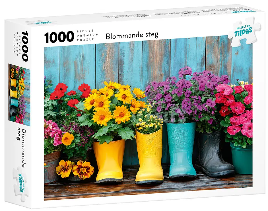 Mot en turkos trävägg står färggranna blommor uppradade. En del är planterade i vanliga krukor, medan andra har fått en mer kreativ plantering, nämligen i färggranna gummistövlar!