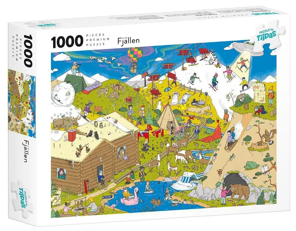 Välkommen till en härligt aktiv dag i fjällen! Här flockas fjällturisterna för att åka skidor och njuta av naturen och dess rika djurliv. Ett detaljrikt humormotiv fullt av liv och rörelse tecknat av illustrerat Joel Folkesson.