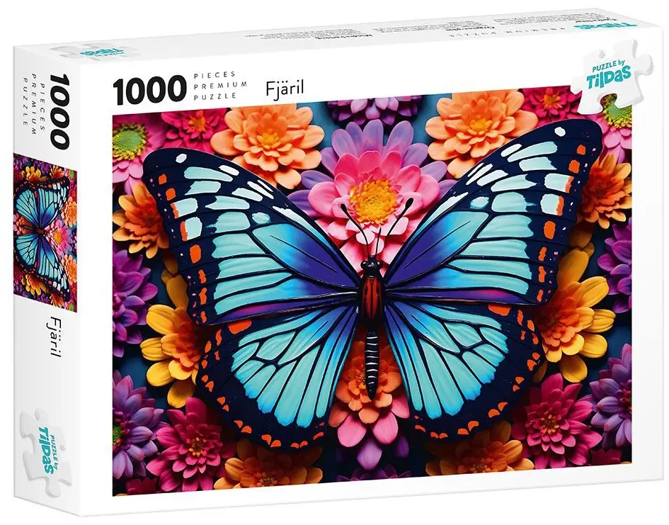 En stor fjäril har landat i ett hav av utslagna blommor. Ett pusselmotiv som passar perfekt för dig som gillar färg och mönster!