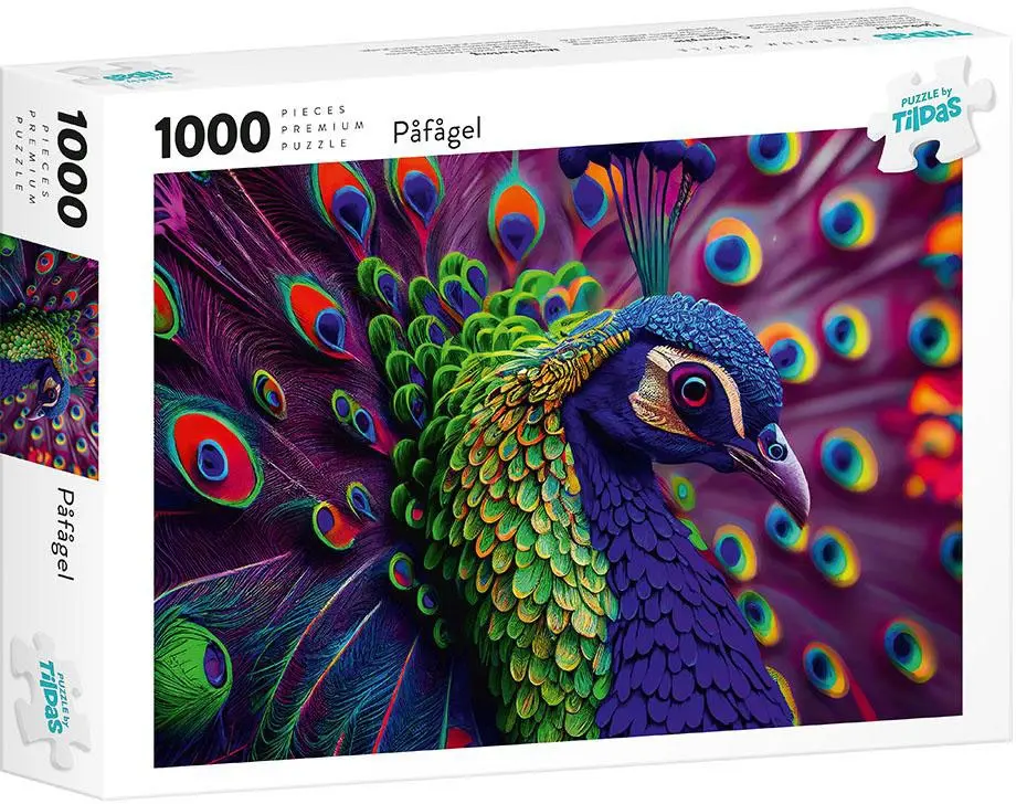 Endast de manliga påfåglarna har fjädrar så färgglada som dessa, som de använder för att imponera på (och förhoppningsvis locka till sig) en framtida partner. Ett färgglatt pusselmotiv med mycket små detaljer.