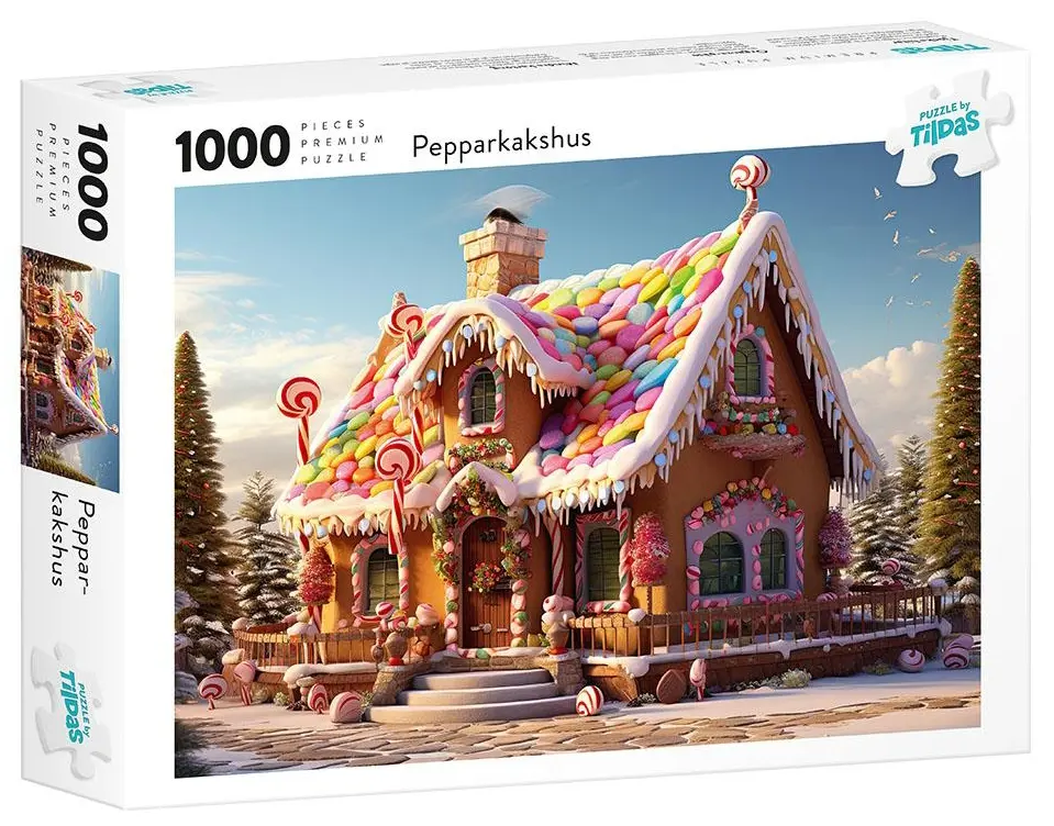 Motivet för onekligen tankarna till sagan om Hans och Greta. Och man bör nog ha lite godis till hands medan man pusslar för att inte bli allt för suktad. Hör man inte till och med en liten röst där inifrån som säger "knaperi, knaperi, knus...vem är det som knaprar på mitt hus"?!