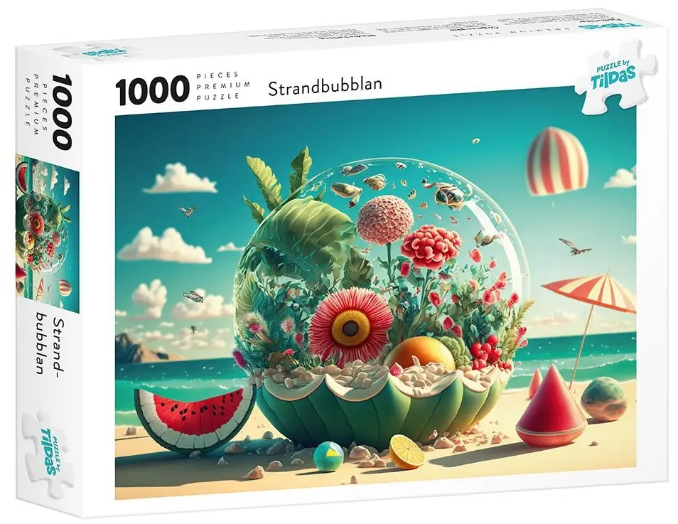 På den här magiska stranden finns en sällsynt strandbubbla. Likt en stor pärla vilar den i ett snäckskal och är fylld av växtlighet, rosa blommor och spännande invånare. Omkring bubblan sträcker sig en strand med vit sand och havet skimrar av turkosblå vågor. Runtomkring ligger färgstarka frukter och några insekter verkar intresserade, de undrar säkert hur de ska ta sig in i bubblan och komma åt nektarn i de där fina blommorna!
