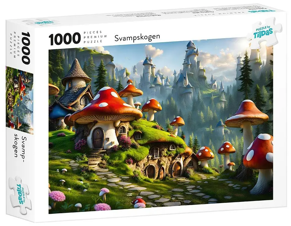 I en förtrollad del av skogen ligger en liten svampby. Här bor invånarna väl gömt under svamphattar och i de mossbeklädda mjuka kullarna. I bakgrunden syns ett maffigt slott, vars torn sträcker sig mot den blå himlen likt grå bergstoppar.