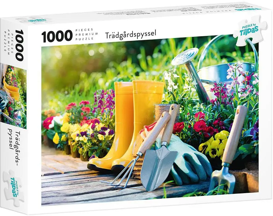 Olika trädgårdsredskap är i fokus i det här pusselmotivet av en vacker blomstrande trädgård.