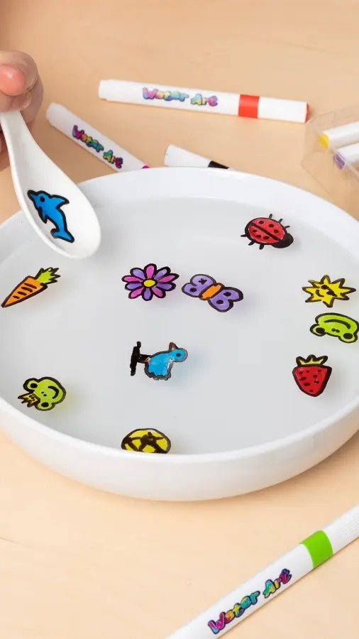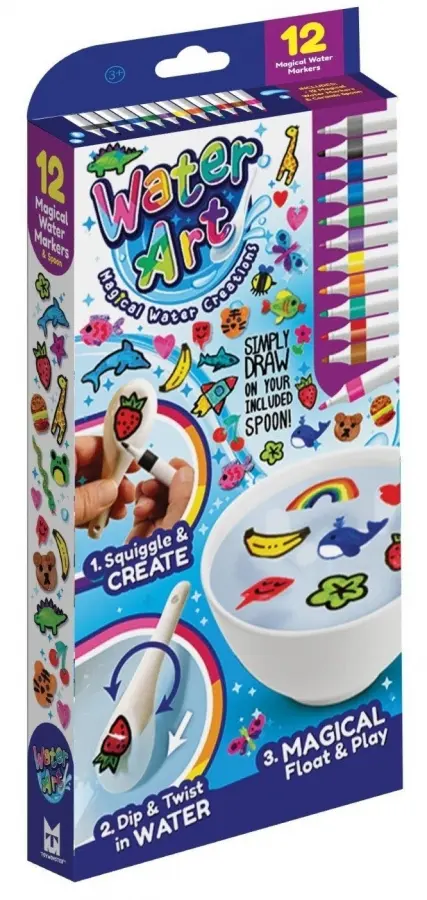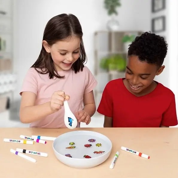 Rita helt enkelt dina kreationer på baksidan av den medföljande skeden, doppa och vrid dem i en skål med vatten och se hur dina kreationer flyter på vattnet. Börja skapa och se dina teckningar komma till liv!