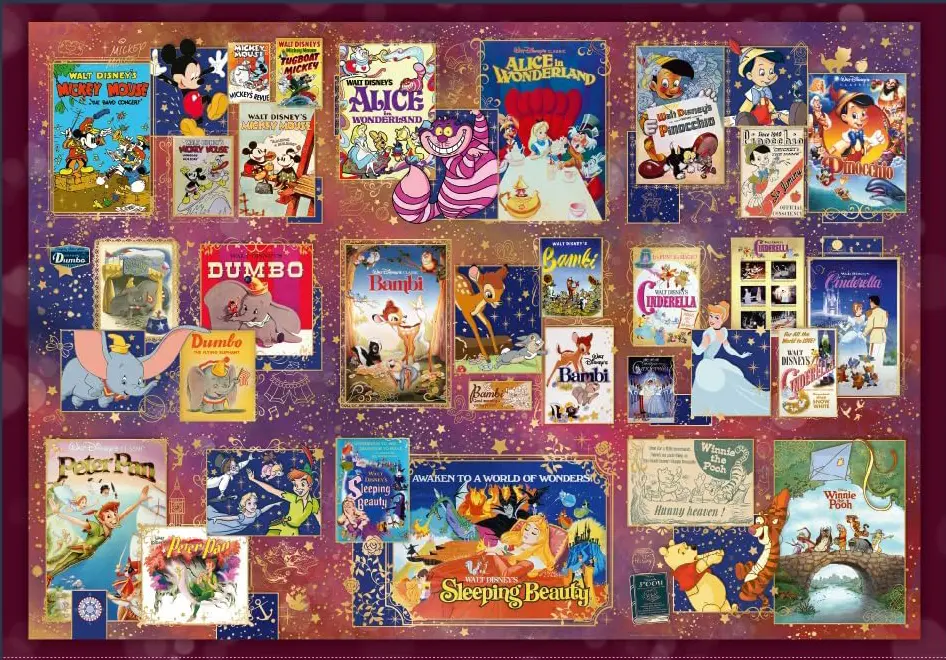 Ett stort kollage med bilder från tidiga Disneyfavoriter, mot en bakgrund i rosa och lila toner och med sirliga guldfärgade symboler från filmerna och guldstjärnor. Här syns bilder ur Peter Pan, Alice i underlandet, Musse Pigg, Dumbo, Bambi, Askungen, Törnrosa och Nalle Puh.