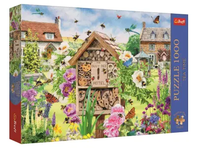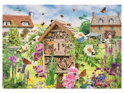 På "The Busy Bee Hotel" är det nästan fullbelagt idag. En mängd insekter flockas för att få rum i det fina lilla insektshuset i trä. Det ligger också vackert beläget bland trädgårdsblommor på landsbygden och i bakgrunden skymtar man vackra villor i sten.