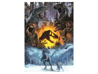 I centrum lyser Jurassic World loggan i ett gyllene sken och omkring den syns några av de allra farligaste dinosaurierna i olika miljöer. Längst ned i motivet syns ett vinterlandskap breda ut sig och två Velociraptorer slår följe över isen.