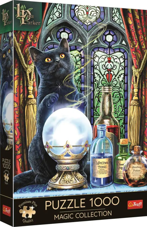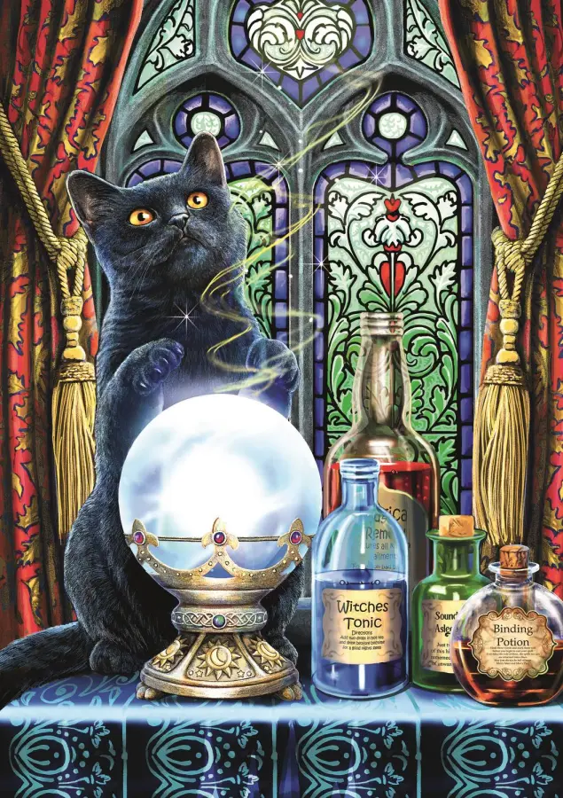 Häxans lärling är ett magiskt motiv av den brittiska illustratören Lisa Parker. Hon inspireras av naturens magi, mytologi och djurliv. Det märks även i detta fantastiska pussel där vi får möta en stor svart katt som tagit plats vid en magisk spåkula. Omkring katten står vackra flaskor med diverse magiska häxbrygder och i bakgrunden syns ett vackert målat glasfönster som kantas av tunga lyxiga sammetsgardiner.