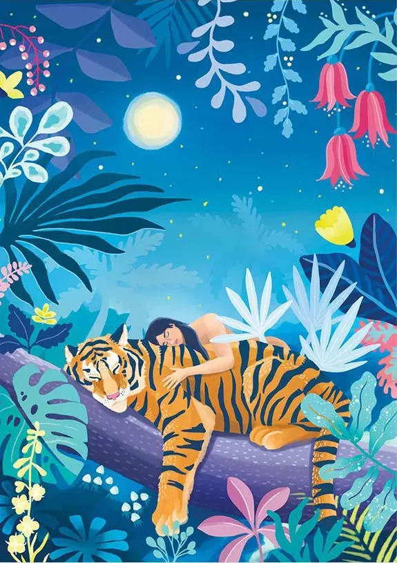 Motiv av konstnären Asia Orlando. en människa ligger och sover tillsammans med en tiger, de är omgivna av en djungel och på himlen lyser stjärnorna ikapp med fullmånen.