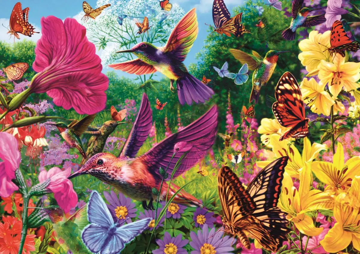 I en blomstrande trädgård ser vi en mängd kolibrier och fjärilar i närbild. Ett färgstarkt och livfullt motiv av den omtyckta och prisade illustratören Steve Read.