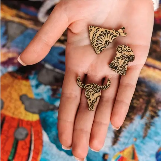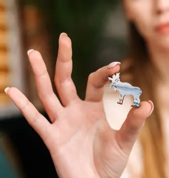 Pusselbitarna är oregelbundna och genomgående i trä. Över 100 av bitar har roliga former av exempelvis djur, naturföremål, hushållsföremål, fordon eller byggnader som gör pusslandet extra roligt.