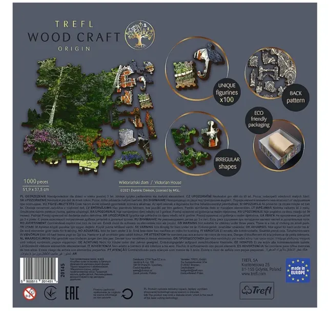 Pusselbitarna är oregelbundna och genomgående i trä. Över 100 av bitar har roliga former av exempelvis djur, naturföremål, hushållsföremål, fordon eller byggnader som gör pusslandet extra roligt.
