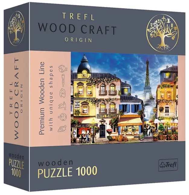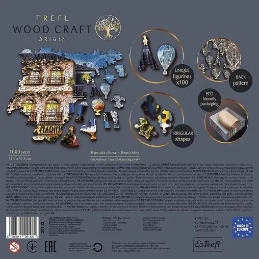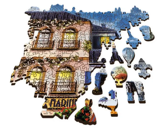 Pusselbitarna är oregelbundna och genomgående i trä. Över 100 av bitar har roliga former av exempelvis djur, naturföremål, hushållsföremål, fordon eller byggnader som gör pusslandet extra roligt.