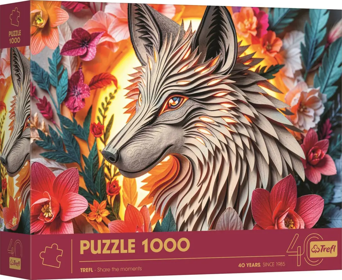 Ett varghuvud sticker fram bland blommor och blad, med en vacker sol i bakgrunden. Pusselmotivet ser ut att vara ett kollage med "lager på lager"-teknik, där papp har vikts skickligt och placerats på varandra i skikt för att skapa en 3D-känsla. Bilden är skapad med hjälp av programmet Leonardo AI.