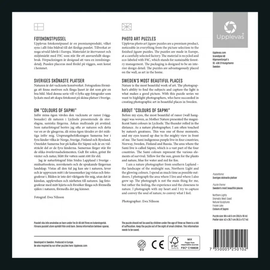 Upplevas vill i den här pusselserien höja fotografer som skapat fotokonst av olika platser i det vackra svenska landskapet. Speciellt fokus ligger på den naturliga belysningen och rätt motiv. Affisch medföljer.