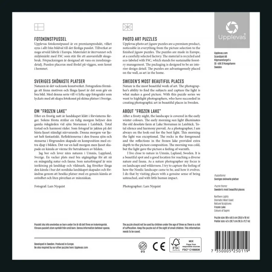 Upplevas vill i den här pusselserien höja fotografer som skapat fotokonst av olika platser i det vackra svenska landskapet. Speciellt fokus ligger på den naturliga belysningen och rätt motiv. Affisch medföljer.