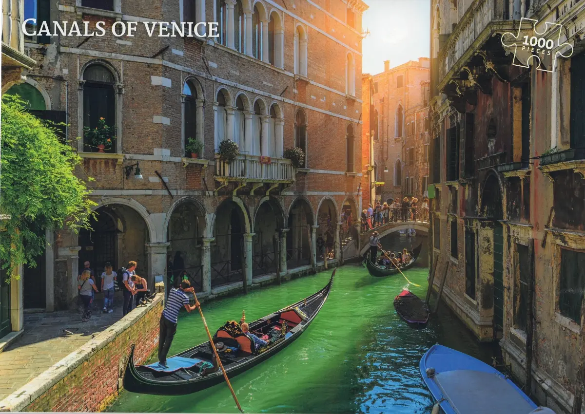 En klassisk vy från Venedig, Italien. Gondoler glider fram längs en kanal med vackra gamla husfasader på sidorna och en av stadens många broar i bakgrunden. Solens strålar letar sig fram mellan byggnaderna, liksom turisterna som ständigt är närvarande i stadsbilden.