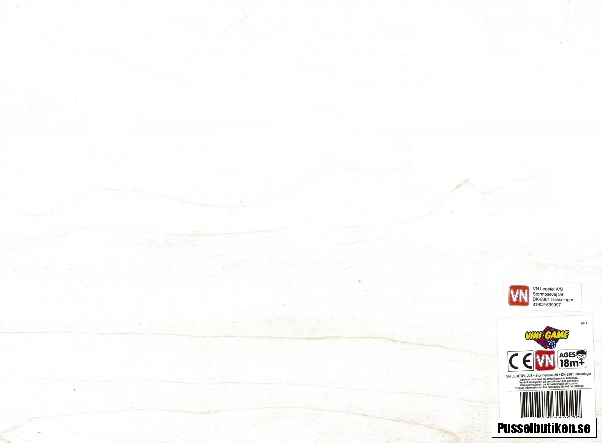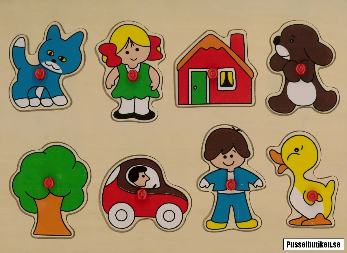 Knoppussel i trä med 8 pusselbitar där vardera har en röd platsknopp. Placera ut alla figurerna på sin rätta plats. I motivet hittar du människor, en bil, ett träd och flera djur.