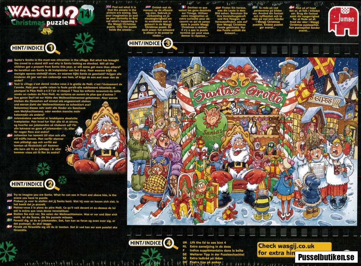 Innehåller 2 st pussel. Det ena pusselmotivet är den bild du ser på kartongen. Det andra motivet är som vanliga Wasgijpussel, här pusslar du istället det människorna på bilden ser! Ett extra roligt pussel för dig som gillar pusselutmaningar.