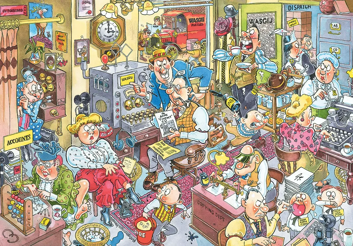 Men hur ser det här kontoret ut på 90-talet med nymodigheter som datorer och mobiltelefoner? Föreställ dig denna livliga kontormiljö men med 90-talets moderniteter. LÄgg pusslet och ta reda på hur det ser ut!