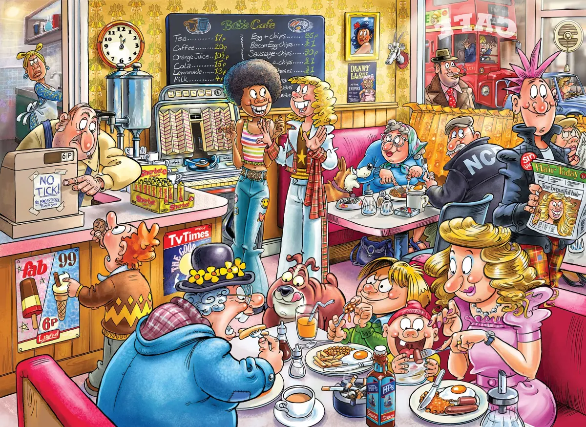 Caféet "Greasy Spoon" var en plats där man åt friterad mat som sköljdes ner med söta drycker och mjölkigt te. Kaffe serverades bara på ett sätt och chips ingick i varje måltid. Snabbspola dig fram till idag, till en värld av mochas, lattes och mjölk på ett dussin olika sätt. Är den moderna versionen av caféet fortfarande "chips med allt", eller har det blivit mer koffein- och proteindrivet? Det här är scenen du måste pussla!