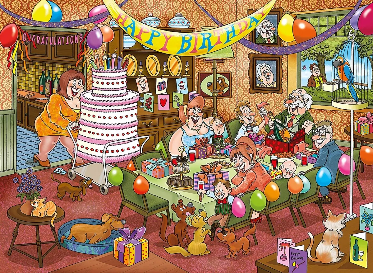 Det är morfars födelsedag och det är dags att fira. Hela familjen är samlad runt bordet. De ser på när farfar öppnar öppnar sina presenter och gör sig redo för födelsedagstårtan. Använd din fantasi och ledtrådarna på kartongen för att lista ut vad som kommer att hända härnäst? Det här är scenen du ska pussla!
