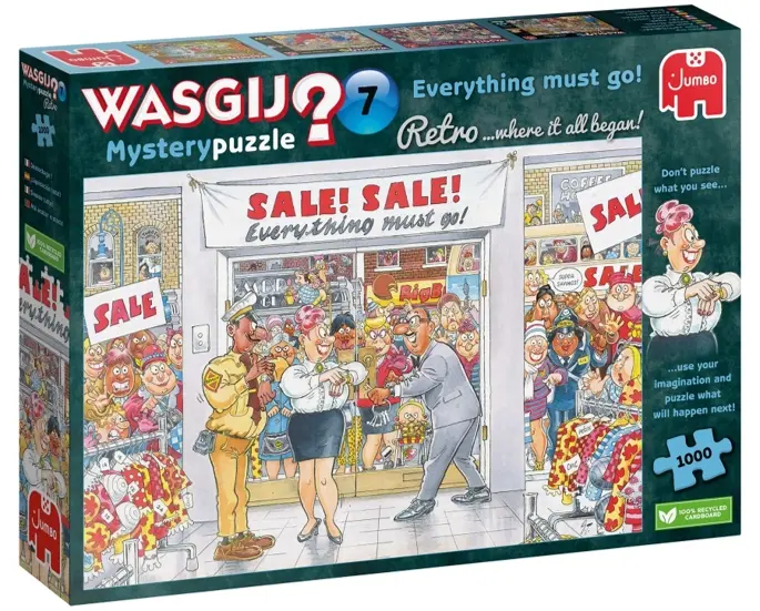 I scenen på pusselkartongen kollar säkerhetsvakten och kassörskan på sina klockor medan chefen öppnar upp för dagen. En hord av shoppare väntar spänt på att få tag på de fantastiska erbjudandena, är den här butiken förberedd för "Everything Must Go"-rean?